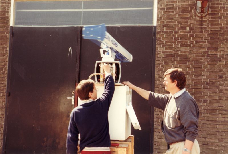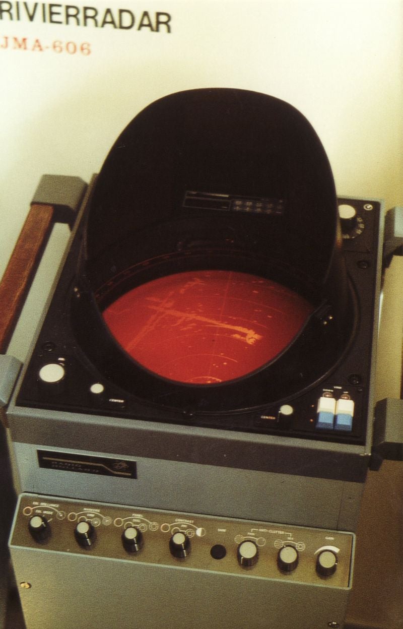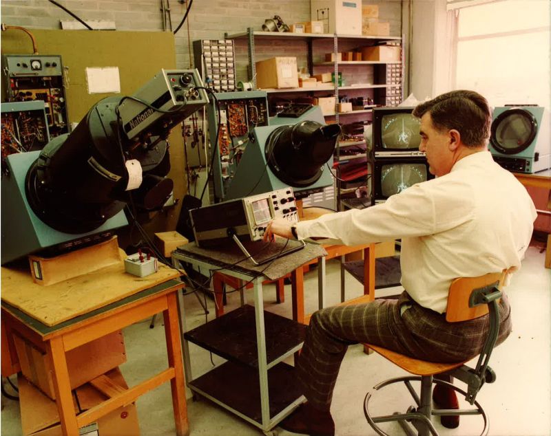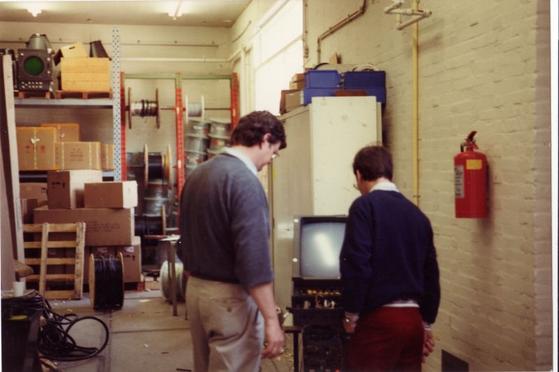 OP HET HOOFDKANTOOR OSDORP MODIFICEERDE DHR. KURK ( DACHT IK ) DE OVERBEKENDE KH17/12RB RADAR VOOR SPECIALE TOEPASSING MET EEN VIDEO CAMERA ( LINKS) EN EEN VIDEO-MONITOR (RECHTS)